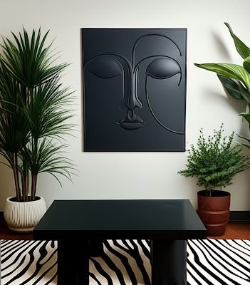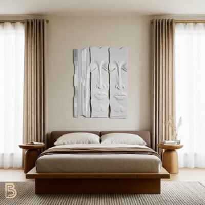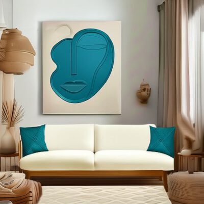 Striking abstract 3D wall art feturing two face in contrasting blue and biege tones .bold modern statement piece.