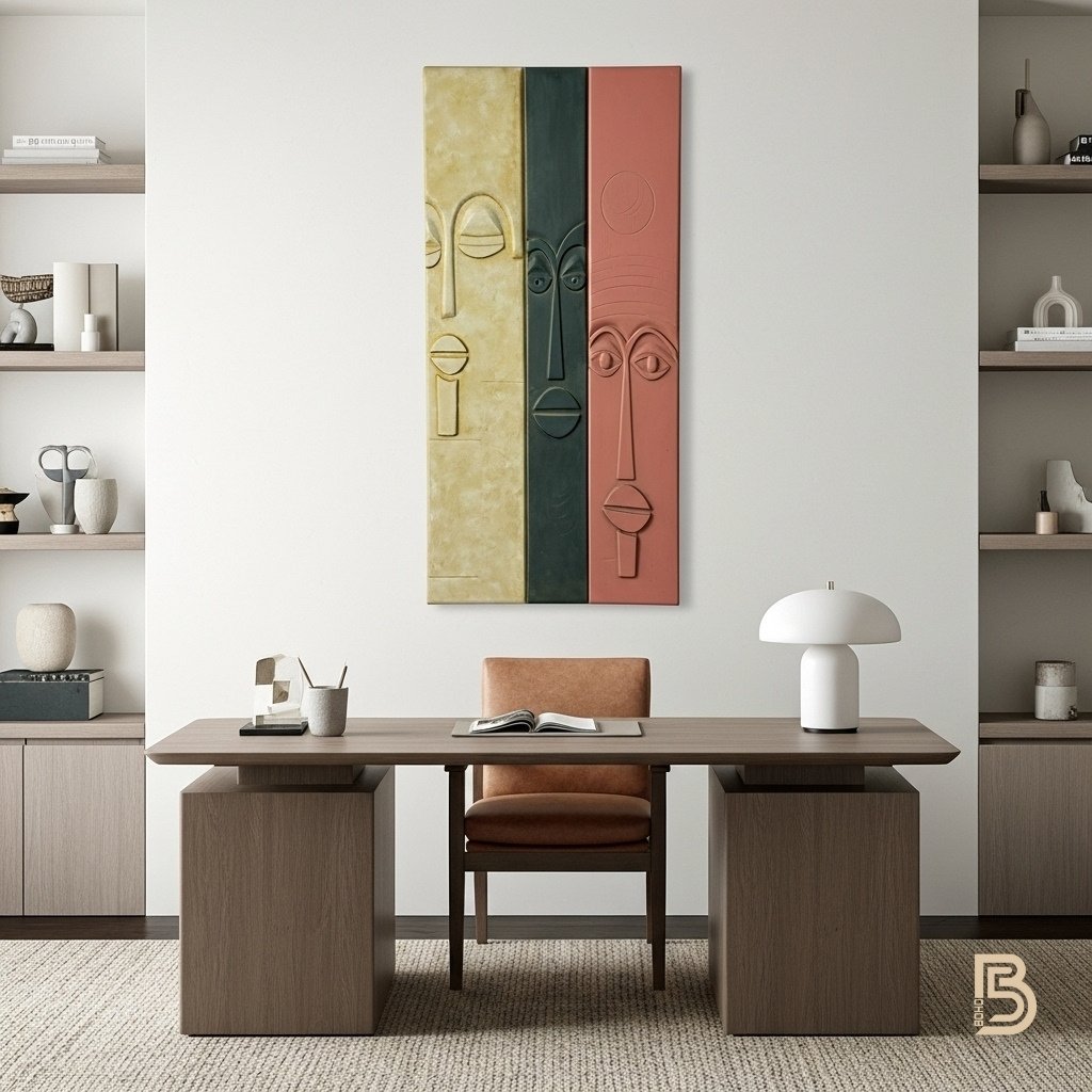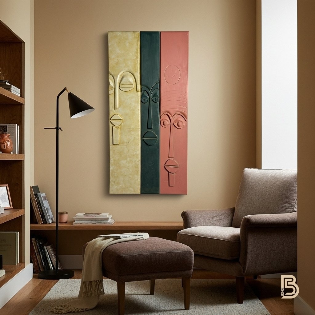 A colorful wooden wall art piece divided vertically into three equal sections.The design uses bold ,warm colors and intergrates an abstract carving of a human face featuring primitive ,simple features along the lines seprating the colors.