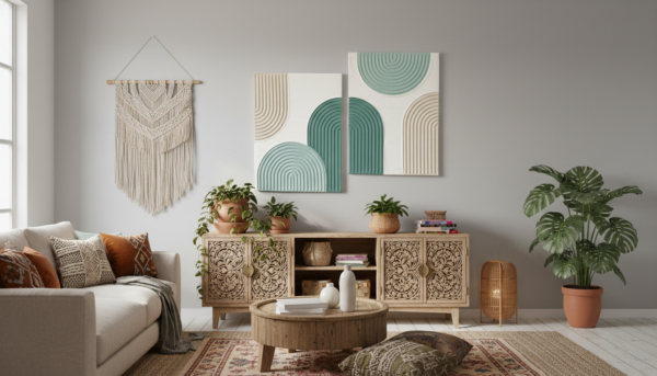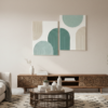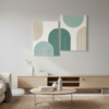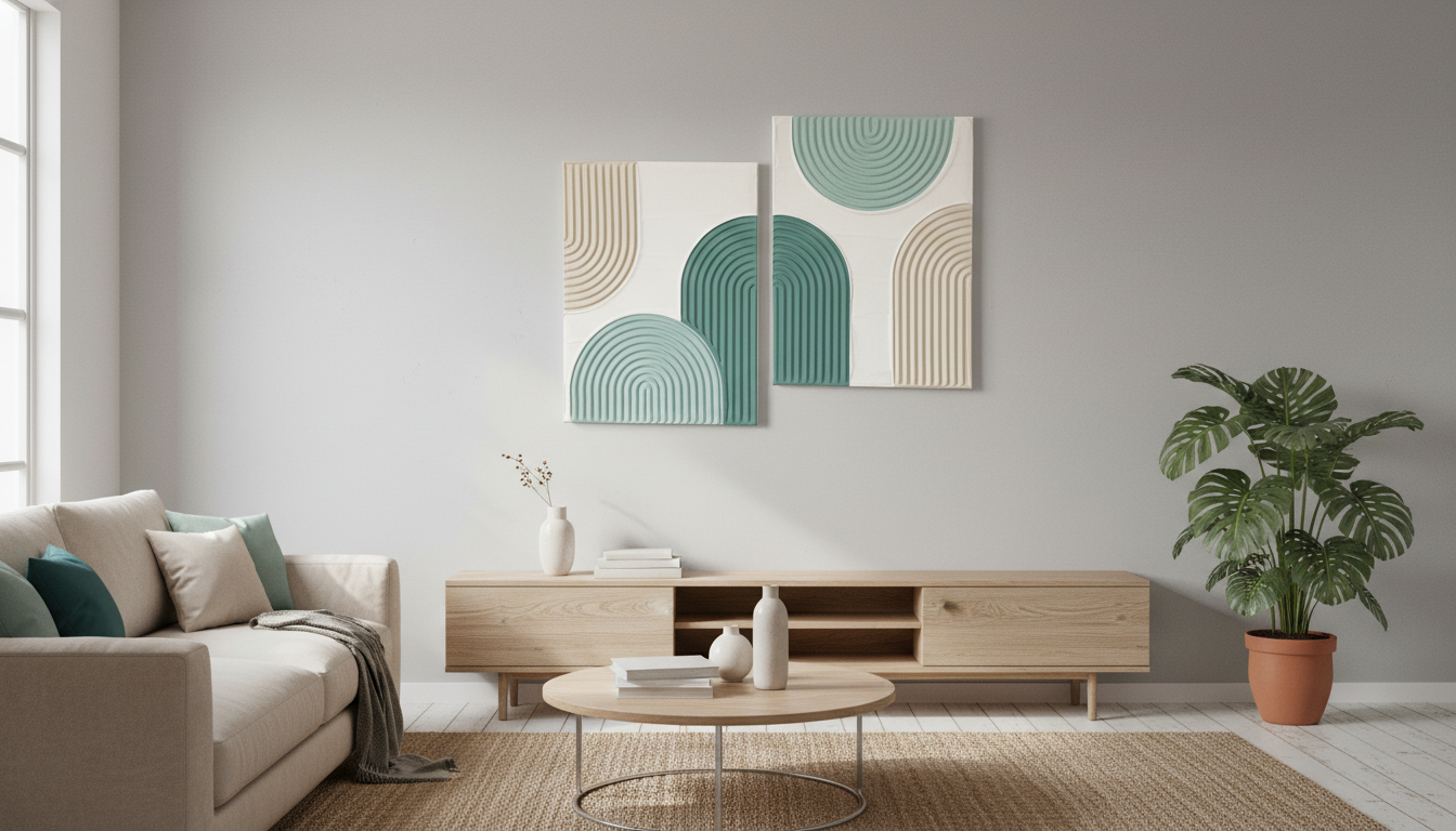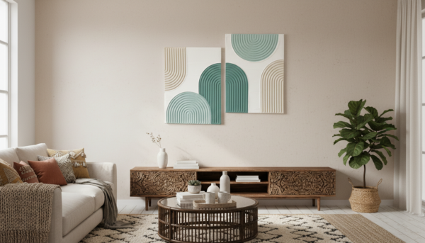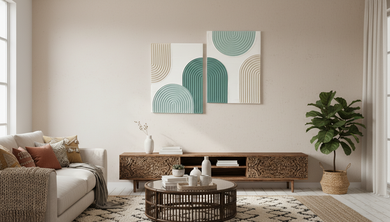 “Hand-sculpted and elegantly minimalist. Our Azure Waves set combines organic geometric shapes with a soothing coastal palette. Its rich, ridged texture adds depth to any neutral wall, making it an essential statement piece for your bohemian-inspired living space.”