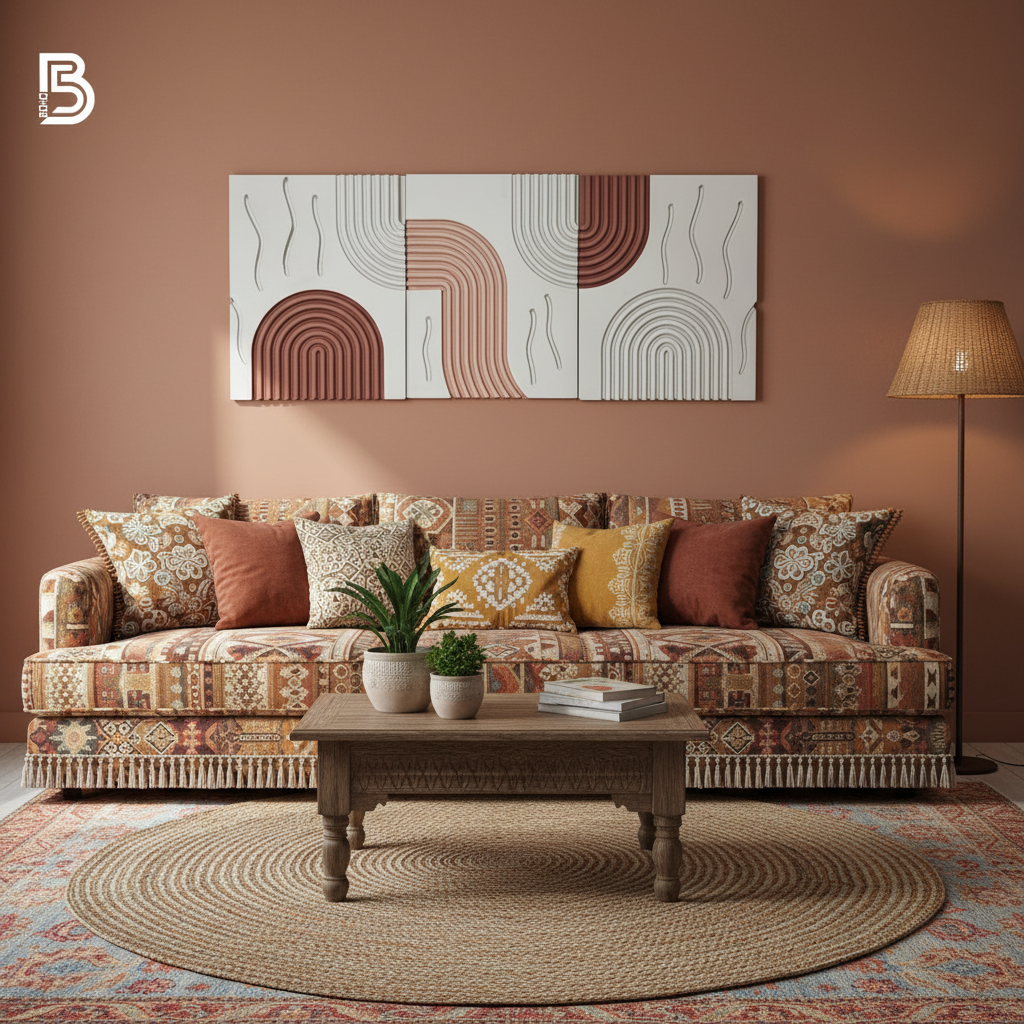 “Infuse your home with a gentle, rosy glow. The Blush Horizon triptych features beautifully hand-sculpted arches in a soft palette of dusty rose, terracotta, and creamy white. With its rich, tactile texture and minimalist aesthetic, this 3-piece set is designed to bring a warm, calming energy to your bedroom or living room walls.”