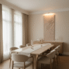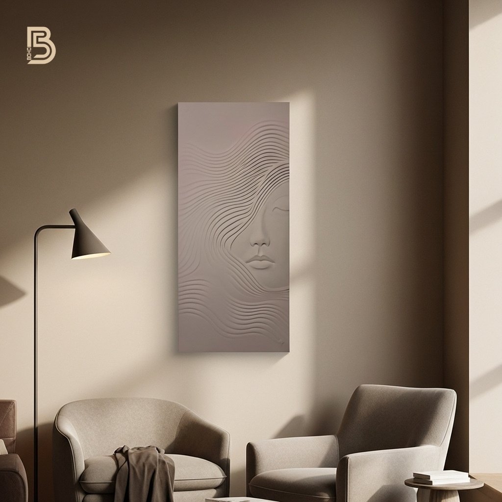Monochrome 3D wall art featuring a secrene face surrounded by flowing , textured lines. Creates a sense of movement and tranquaility.