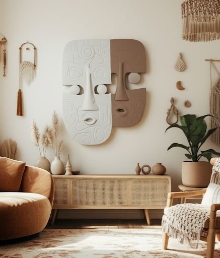 This striking piece features two interlocking abstract faces, bringing a modern and intriguing bohemian vibe to your space.