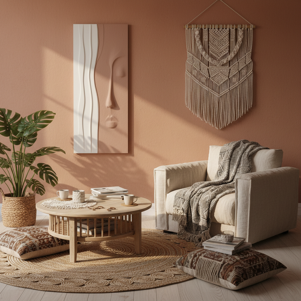 “Capture the essence of tranquility with the Serenity Muse Relief. This exquisite handcrafted piece features a softly sculpted face emerging from a warm, blush-toned background, accompanied by fluid minimalist waves. Its delicate 3D texture creates a sense of peaceful movement, making it an ideal soul-soothing addition to your bedroom or meditation space.”