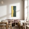 A vibrant and unique painting that combines luxurious gold toned yellow with claming forest green.the design features a stylized, contemplative gaze that adds a deep, soulful quality to the artwork.