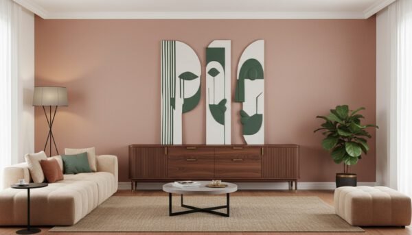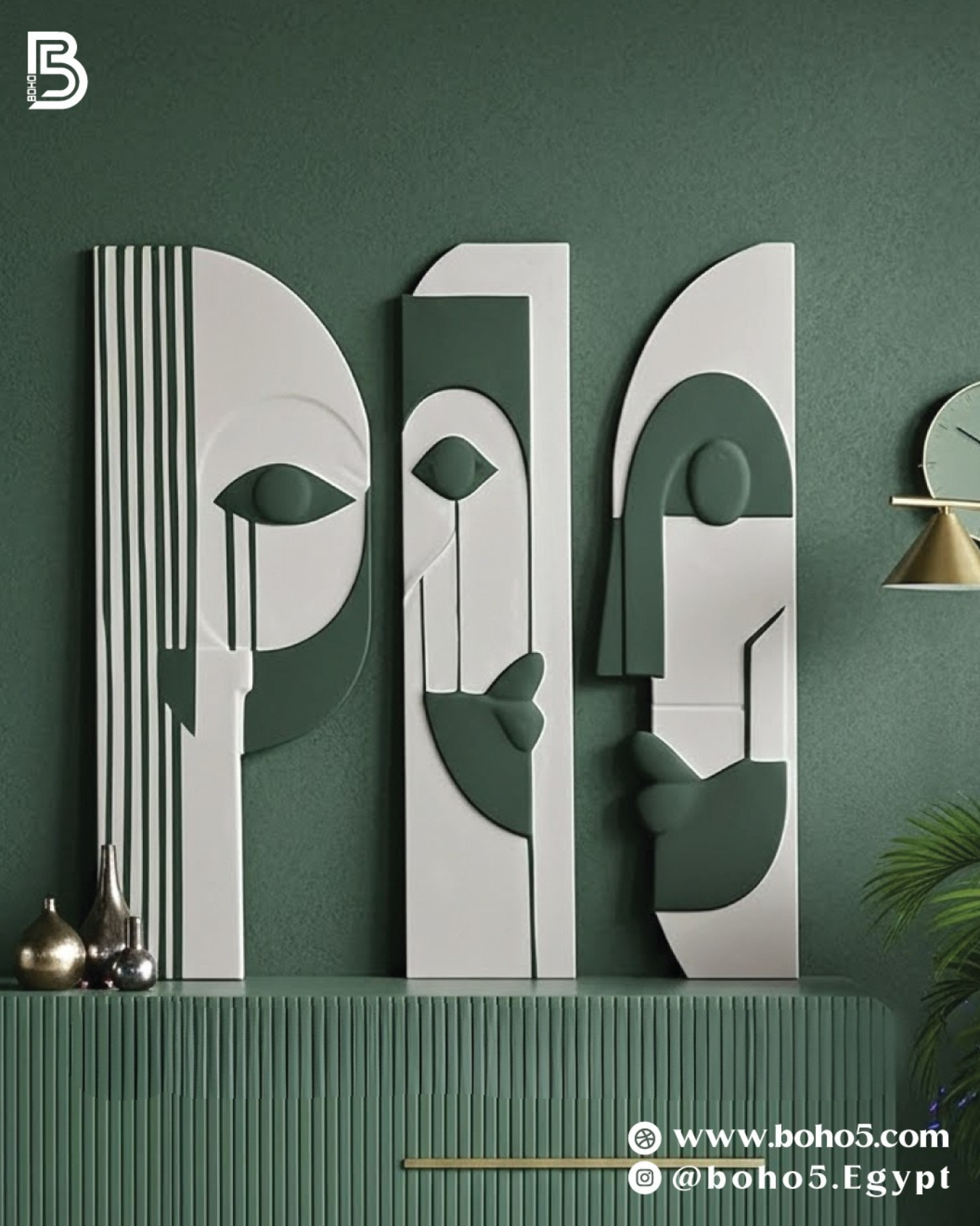 “Transform your living space into a modern art gallery with our Emerald Persona Set. This striking 3-piece relief collection features handcrafted abstract faces in a sophisticated palette of deep sage and ivory white. Its bold, geometric 3D shapes create a captivating dialogue between light and shadow, perfect for a high-end bohemian or minimalist interior.”