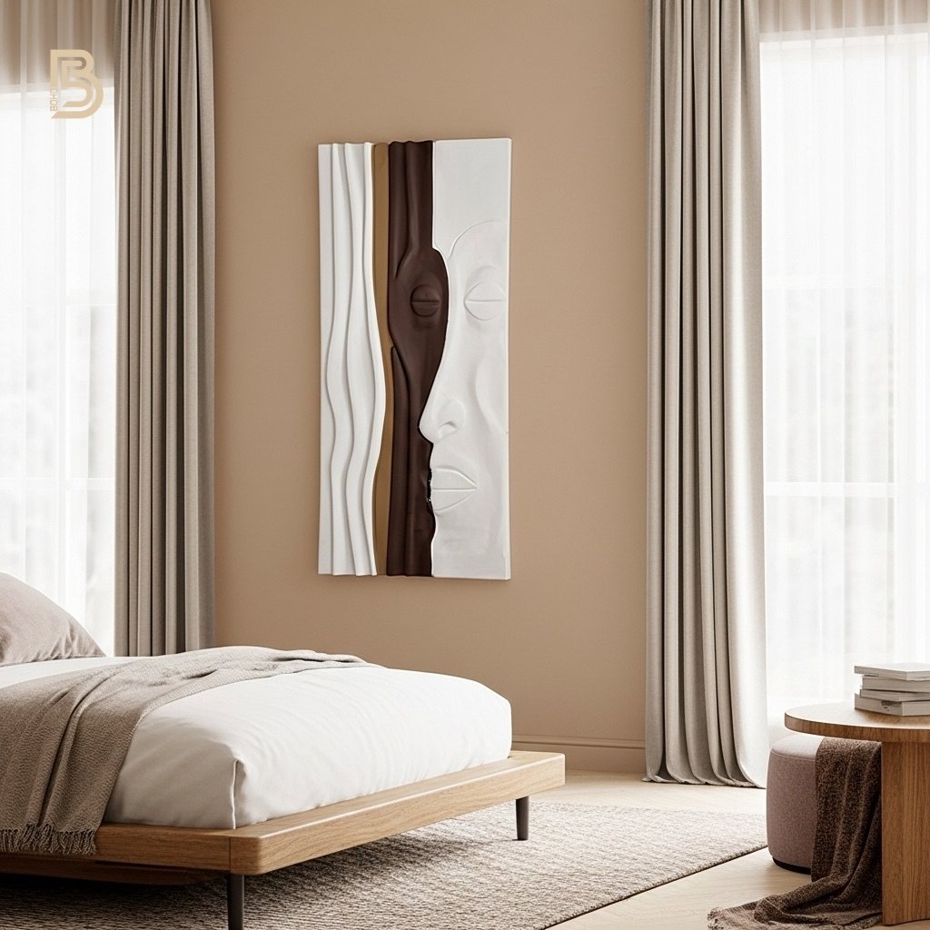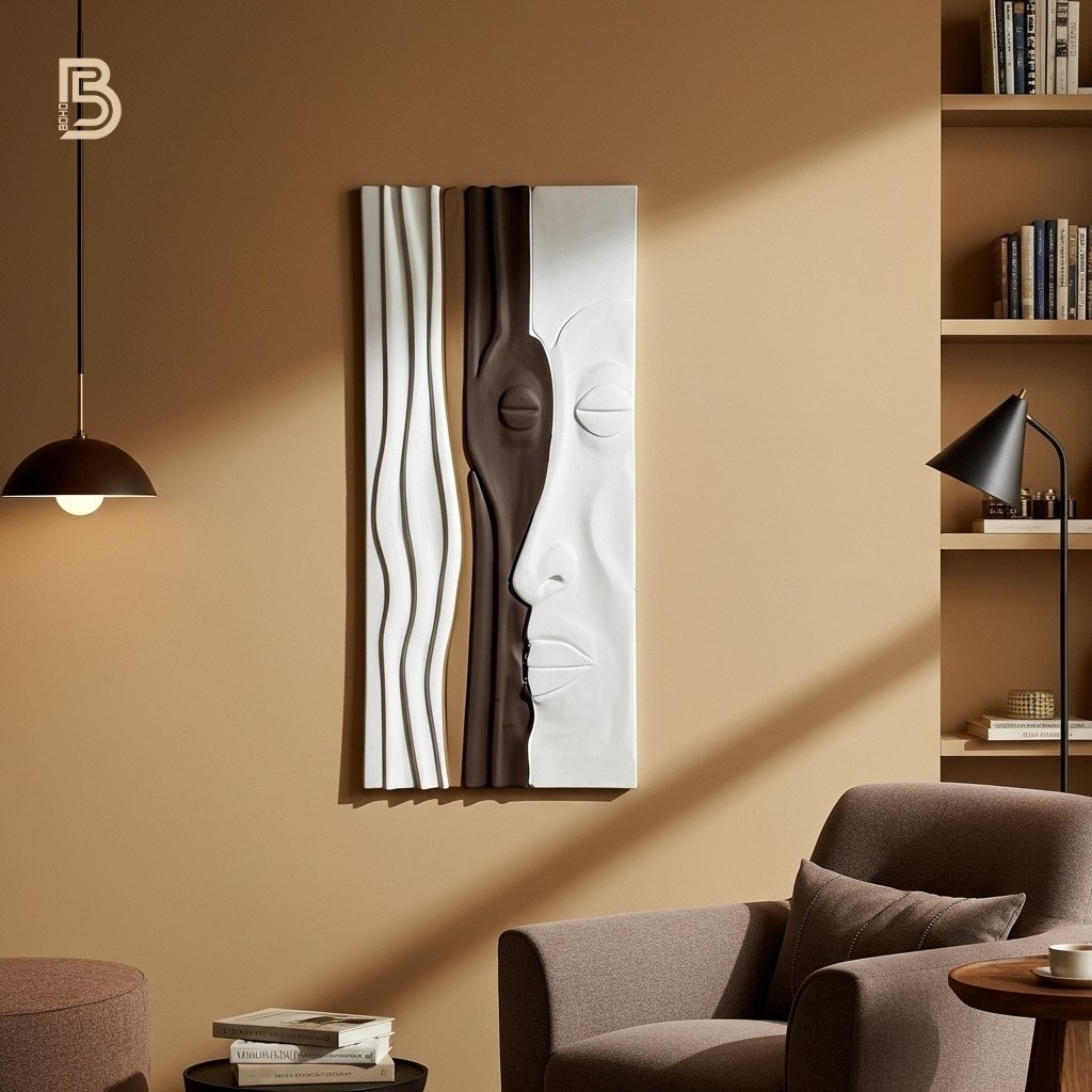 A carved wooden all art piece featuring an abstract design that combines dark and light colors .it uses smooth, flowing lines to depict a wave-like texture,while a minimalist side profile of a human face emerges distinctly at its center.