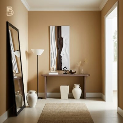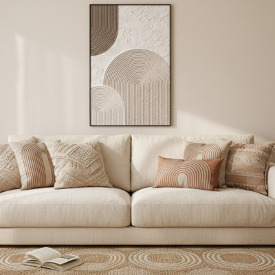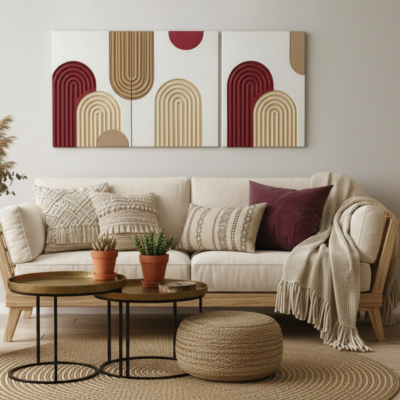 “Experience the perfect harmony between raw nature and geometric precision. The Sandstone Arches features a rich, heavy-textured background contrasted with meticulously sculpted 3D curves. Its warm, earthy palette of beige and deep taupe brings a grounded, calming energy to any modern boho home.” L118*W50