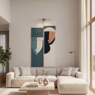 “Transform your living space into a modern art gallery with our Emerald Persona Set. This striking 3-piece relief collection features handcrafted abstract faces in a sophisticated palette of deep sage and ivory white. Its bold, geometric 3D shapes create a captivating dialogue between light and shadow, perfect for a high-end bohemian or minimalist interior.” x3…
